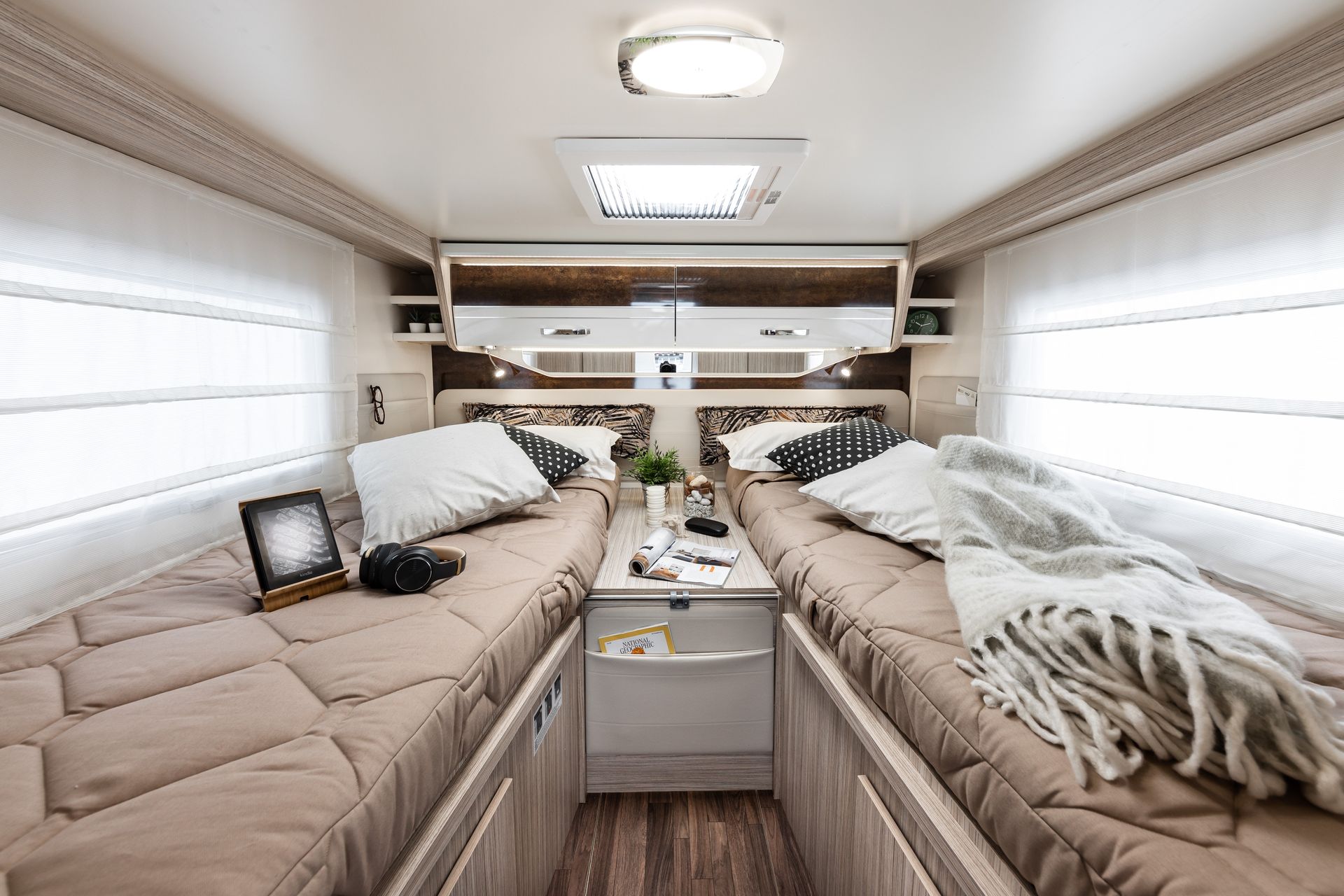 At the back you will find two spacious twin beds (200 x 80 cm), which you can easily convert into a maxi double bed (200 x 212 cm) for a cozy night.