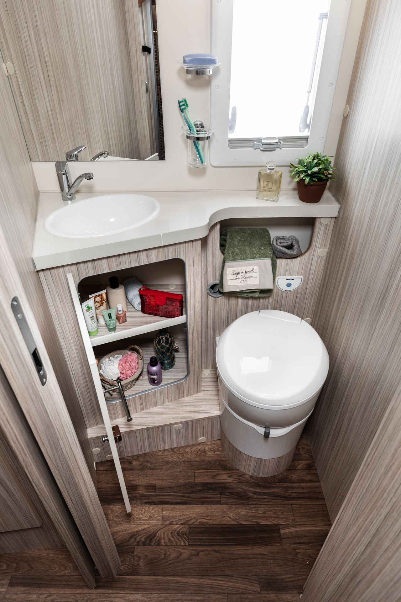 A wooden partition door provides privacy, while two side windows and three ceiling cupboards offer you space and convenience.