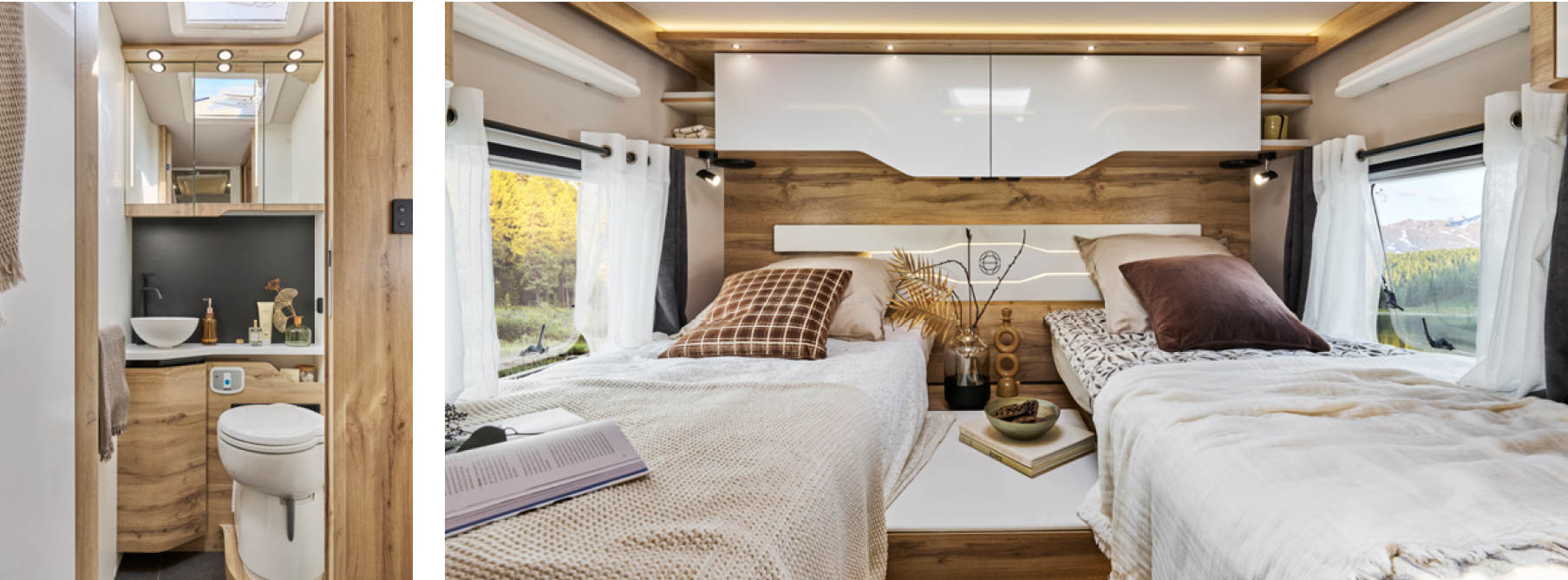 - Facilité d'utilisation : stores électriques, éclairage extérieur LED, chauffage ALDE® diesel/230 V, système de filtration d'eau autonome, dévidoirs électriques pour l'eau et l'électricité, double haut-parleurs dans la chambre, écran Duo Control.