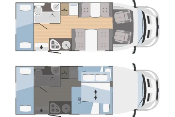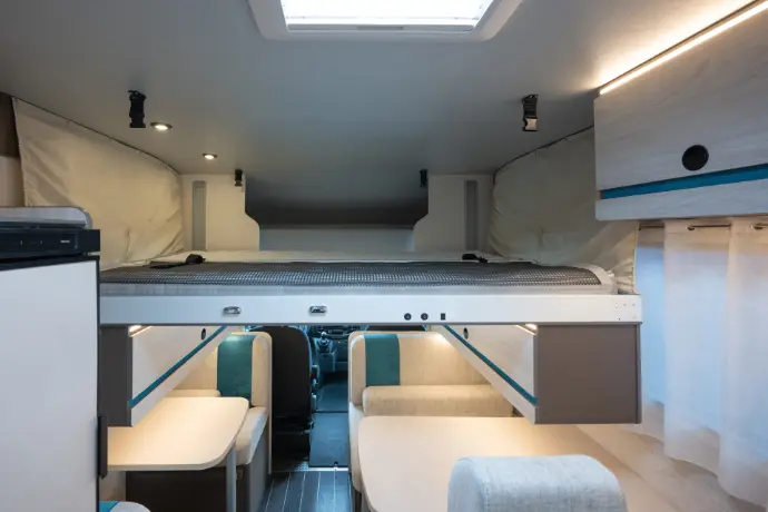 La chambre offre une disposition unique avec des lits superposés et un lit double rabattable, ce qui rend ce camping-car vraiment spécial. Cet espace est parfait pour les familles, avec un confort de couchage suffisant pour deux. Il offre un endroit pratique et confortable pour dormir, afin que chacun puisse bien se reposer pour la prochaine aventure. Du jamais vu pour un camping-car de cette longueur !