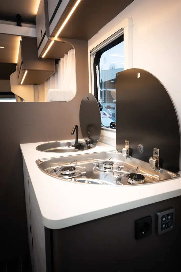 Malgré sa conception compacte, la cuisine du Rimor Kilig 97+ offre beaucoup d'espace de rangement pour tous vos ustensiles et ingrédients de cuisine. Cela permet de cuisiner facilement pour sept personnes et de profiter de la liberté, sans compromettre le confort.