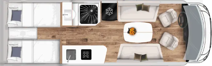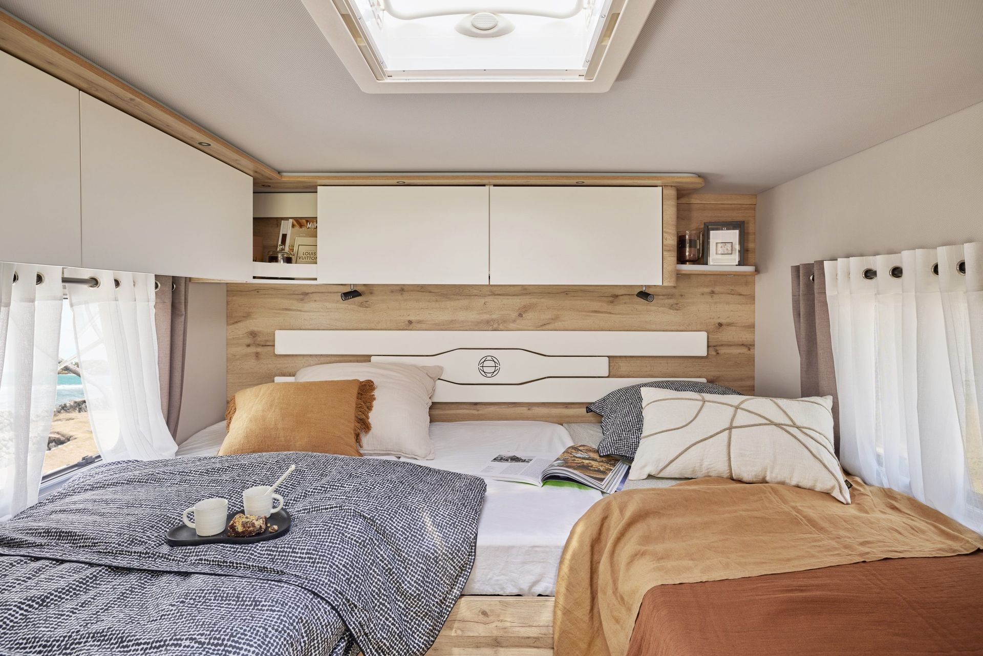 In de slaapkamer van de LV 7.0 GJF vind je rust op maat. De twin beds (190 x 200 cm) bieden comfortabele slaapplek voor twee, maar kunnen optioneel worden omgevormd tot een royaal dubbel bed (200 x 224 cm) voor extra ruimte.