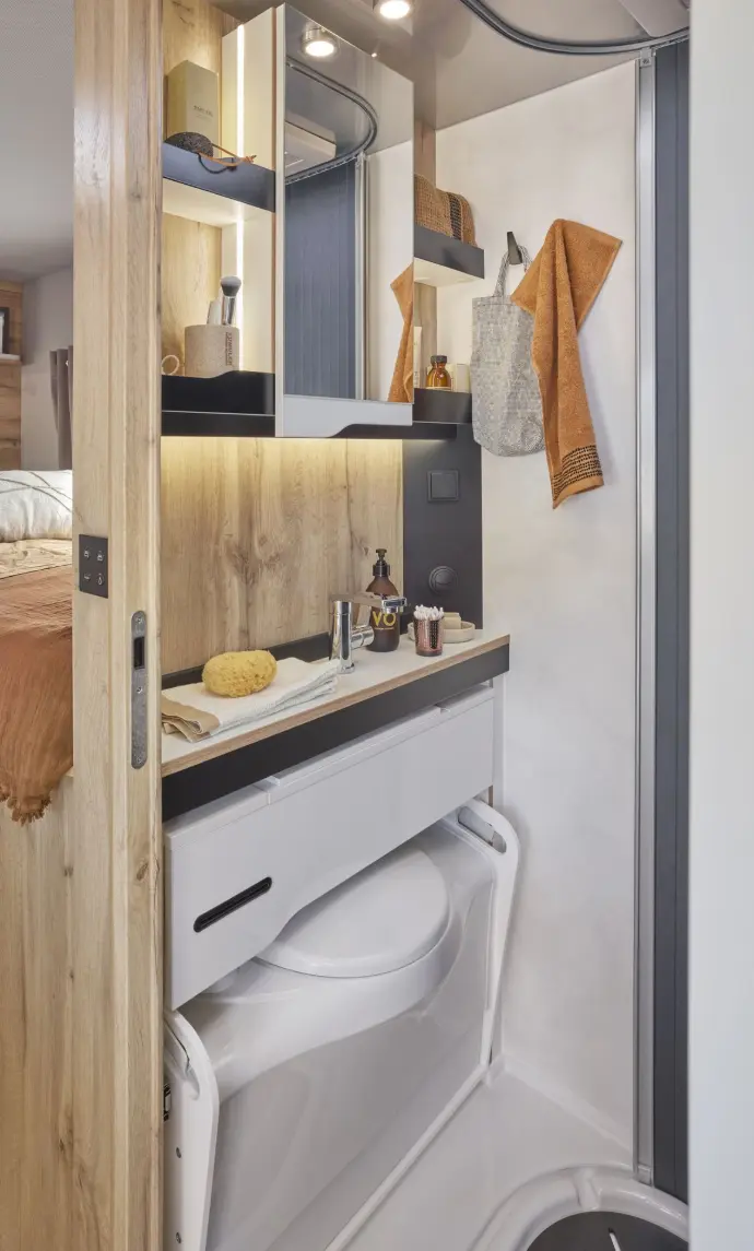 De 3-in-1 badkamer van de LV 7.0 GJF is een slimme oplossing die je versteld doet staan. Met een verschuifbare wastafel en toilet creëer je in een handomdraai een ruime douche, een compacte toiletruimte, of een wasplek.