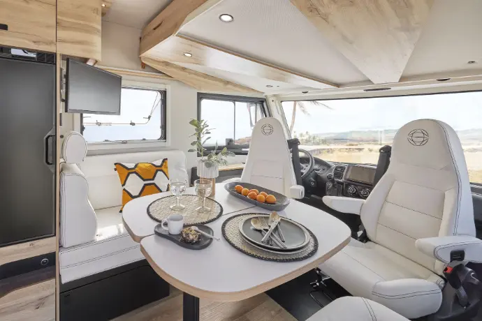 Met keuze uit vijf stoffen en twee houttinten creëer je een interieur dat jouw stijl weerspiegelt – een motorhome die luxe ademt.