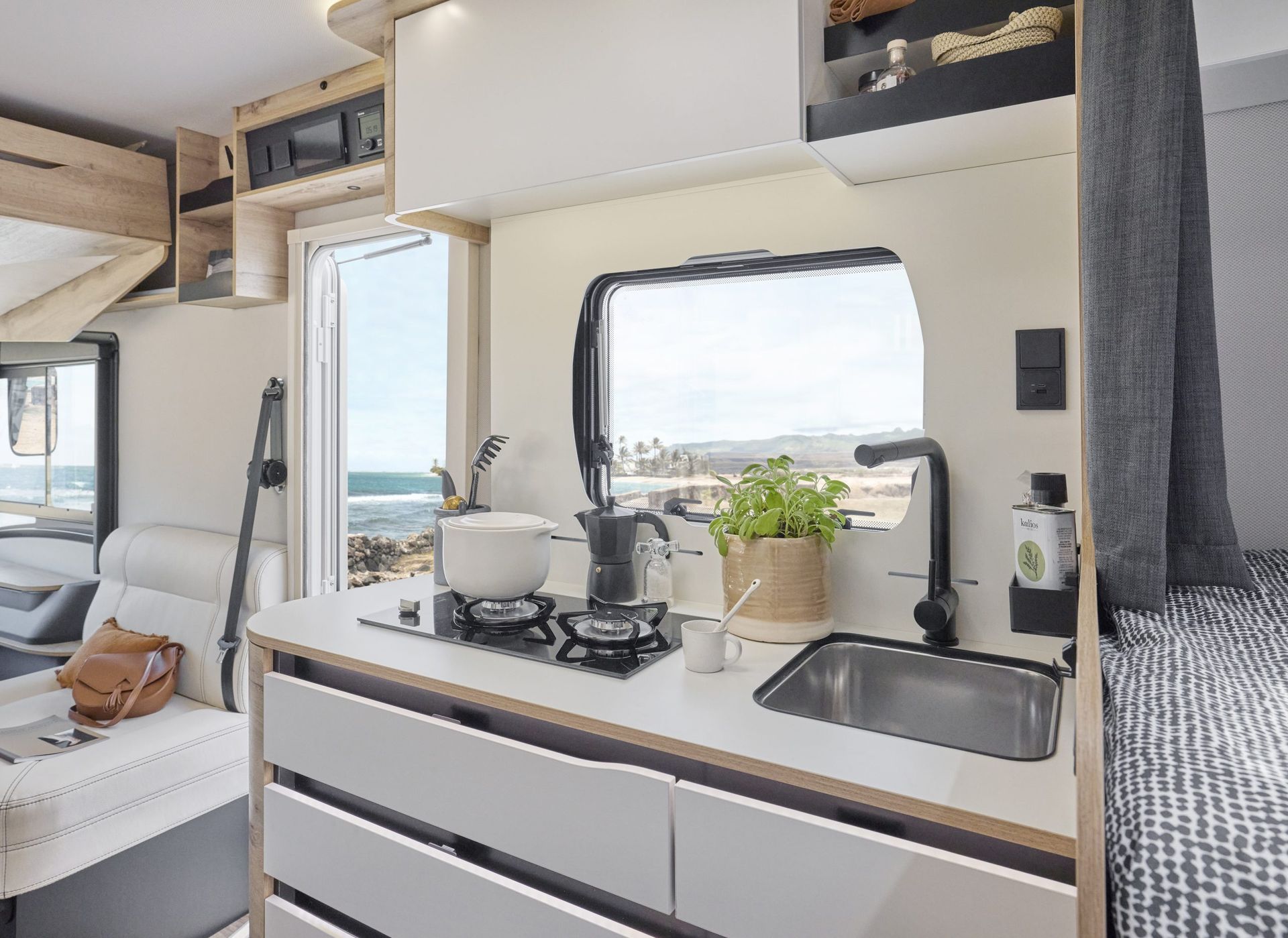 Slimme opbergvakken en hoogglans witte kastdeuren geven een strakke, moderne look. Met het waterfiltersysteem smaakt je koffie altijd puur, en de optionele buitengrillaansluiting laat je buiten koken onder een sterrenhemel.