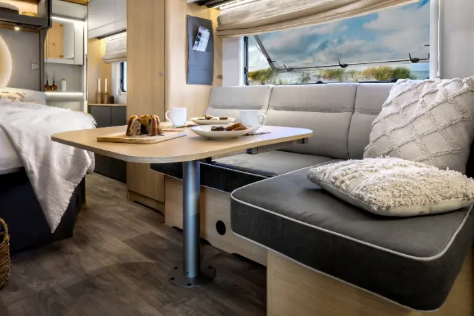 De woonkamer biedt een comfortabele L-vormige zithoek met draaibare voorstoelen, geschikt voor gezellige maaltijden of ontspanning. De slimme indeling maximaliseert ruimte voor vier personen in deze 6,99 meter lange motorhome.