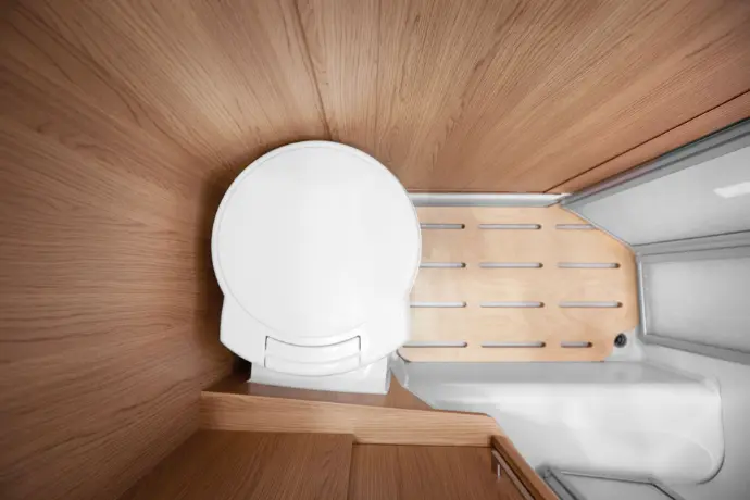 De badkamer combineert een afsluitbare wastafel met een geïntegreerde douche, ideaal voor efficiënt gebruik. De antivingerafdruk-coating zorgt voor eenvoudig onderhoud, perfect voor zorgeloze reizen met het gezin.