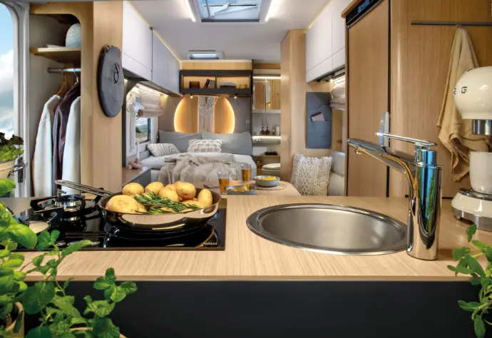 De keuken beschikt over een 3-pits gasfornuis, een 110-liter koelkast met vriesvak en een diepe roestvrijstalen spoelbak. Handige uittreklades en bovenkasten bieden opbergruimte voor keukengerei, terwijl de duurzame, krasbestendige werkbladen koken voor vier personen eenvoudig en plezierig maken.
