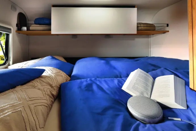 De slaapkamer beschikt over een comfortabel hefbed en een Frans bed (190 x 140 cm), geschikt voor twee tot vier personen. Deze flexibele indeling garandeert een goede nachtrust, ideaal voor koppels of kleine gezinnen.