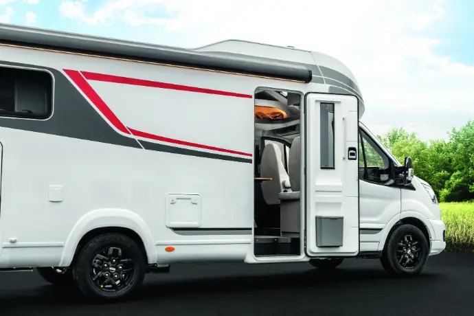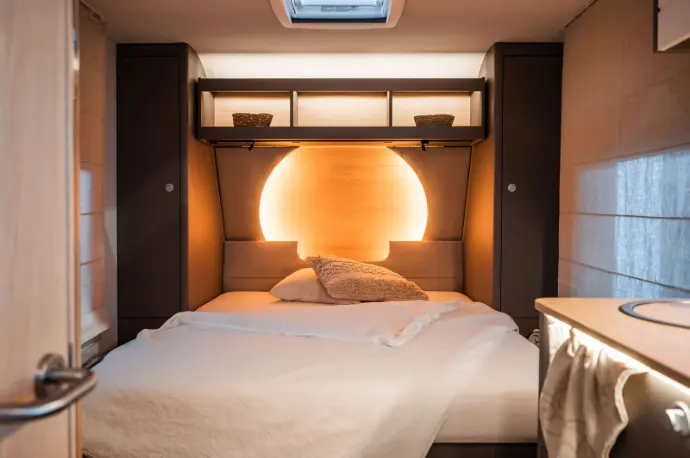 Zachte LED-verlichting zet ’s avonds de juiste sfeer, terwijl ventilatieramen met verduisterende rolgordijnen zorgen voor frisse lucht en een donkere, ongestoorde nacht. De afwerking, met warme houtaccenten en zachte bekleding, geeft een huiselijk gevoel dat je bijna vergeet dat je in een motorhome bent. Of je nu wakker wordt met uitzicht op de bergen of doorslaapt tot de middag, deze slaapkamer maakt elke nacht een genot.
