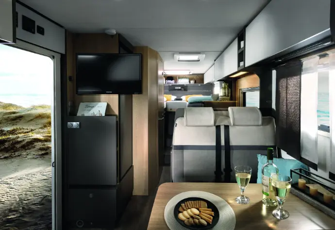 Een gezellige hotspot waar je echt wilt neerploffen na een dag op pad. Stel je een ruime zithoek voor met draaibare captain’s chairs en een comfortabele bank, bekleed met chique vegan leer dat eruitziet als een designmeubel. De uitschuifbare tafel nodigt uit voor een spelletje kaarten of een uitgebreide maaltijd, terwijl grote panoramische ramen zorgen voor een lichte, open sfeer en een vrij uitzicht op de natuur.