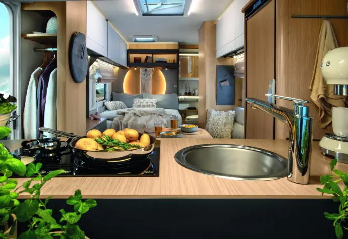 De keuken van de LMC H730 is een compacte, stijlvolle bistro op wielen. Het eiken werkblad biedt ruimte voor koken, met een driepits gasstel en diepe spoelbak. Een 140-liter compressorkoelkast houdt alles fris. Softclose-lades en slimme opbergruimte blijven netjes, terwijl LED-verlichting en grote ramen een gezellige sfeer creëren.