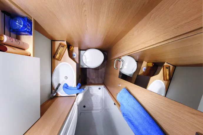 De badkamer van de LMC H730 is een slimme, compacte spa waar je fris de dag begint. Een krachtige douche met thermostaatkraan geeft je dat hotelgevoel, terwijl de draaibare cassette-wc en strakke wastafel ruimte besparen zonder krap te voelen. De spiegelkast en slimme opbergvakken houden je spullen netjes, en een dakraam met ventilatie zorgt voor licht en frisse lucht. Met chique taupe-accenten is deze badkamer klein maar groots in comfort.