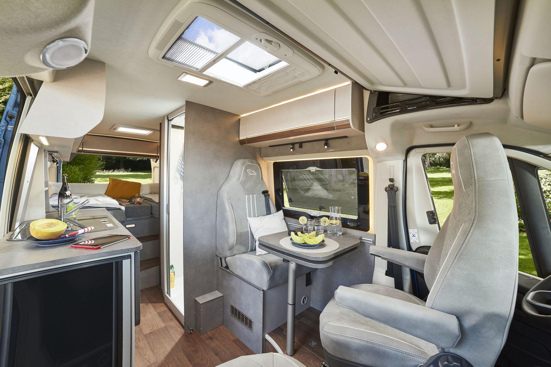 Met de Summit Shine presenteerde PÖSLL in 2016 één van de eerste buscampers met aanpasbare badkamers. Ze beschikken over een draaiwand waardoor je in een handomdraai de toiletruimte kan afscheiden en er een doucheruimte ontstaat. Bij het binnenkomen van deze VAN vallen de ergonomisch gevormde banken meteen op. Een geavanceerde tool die je niet snel ergens anders zal vinden. Kom deze uittesten in onze showroom en ervaar zelf het comfort van deze zetels.